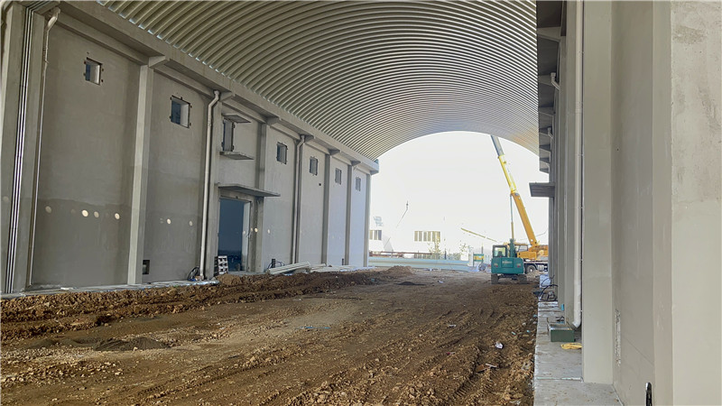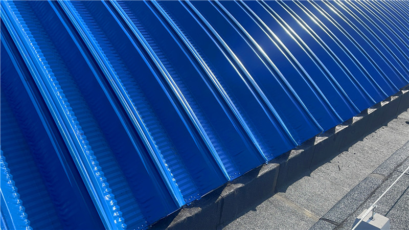 本次拱形波紋鋼屋面采用914-610型結(jié)構(gòu),拱跨18.10米,長度85.82米,總覆蓋面積超1500㎡。屋面選用冠洲品牌彩涂卷,厚度1.0mm,正面海藍色、背面灰白色,兼顧耐腐蝕性與視覺協(xié)調(diào)性。
