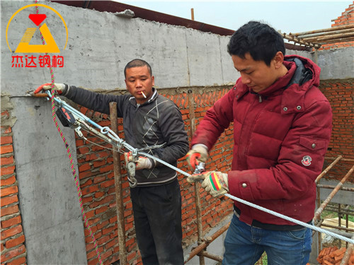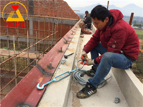 拱形屋頂的磚墻上口以及全鋼結構的鋼柱頂部通常會安裝拉鋼絲繩,以增強結構的受力能力。鋼絲繩一般選用M12或M14規格,既能滿足承載需求,也保證了耐久性。