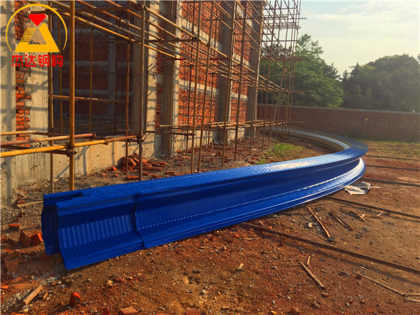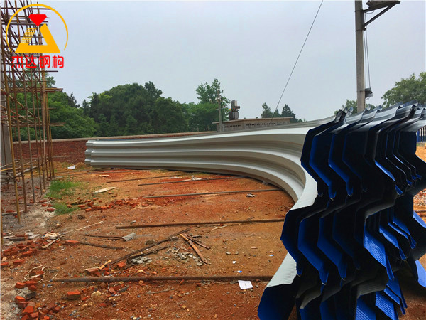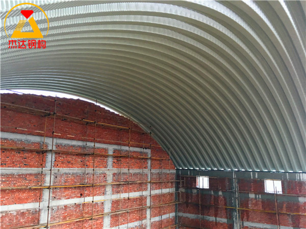 拱形屋頂設計在跨度和長度上經過精準計算,能夠有效承受外部風壓和自重。螺紋鋼的采用增強了屋頂的整體穩定性,托板和彩涂卷板的合理搭配進一步提升了抗腐蝕性能和使用壽命。