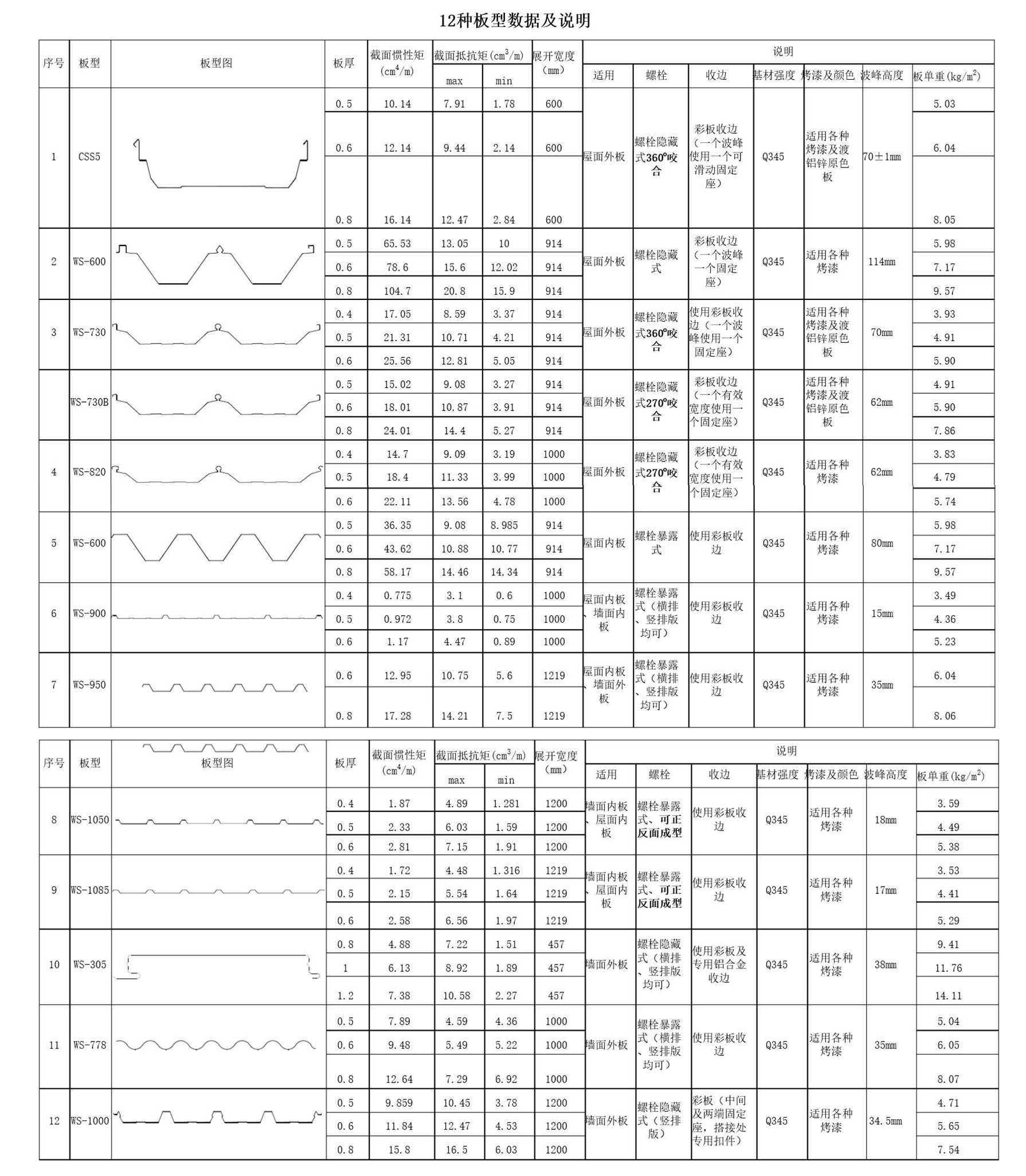 主要用途:屋面板墻面板有效截面特征/板厚(mm)0.40.60.8Letcm4/m6.329.5812.77Wetcm?/m3.284.826.39