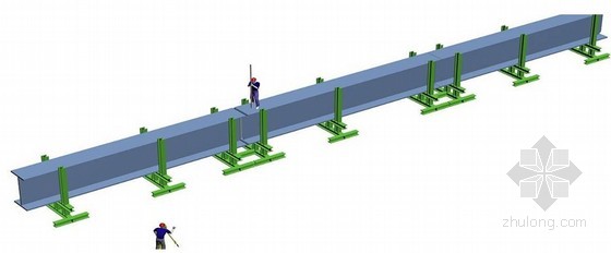 拼裝胎架制作→鋼梁拼裝→鋼梁焊接→焊縫探傷→焊縫補漆→鋼梁吊裝→測量校正→焊接。
