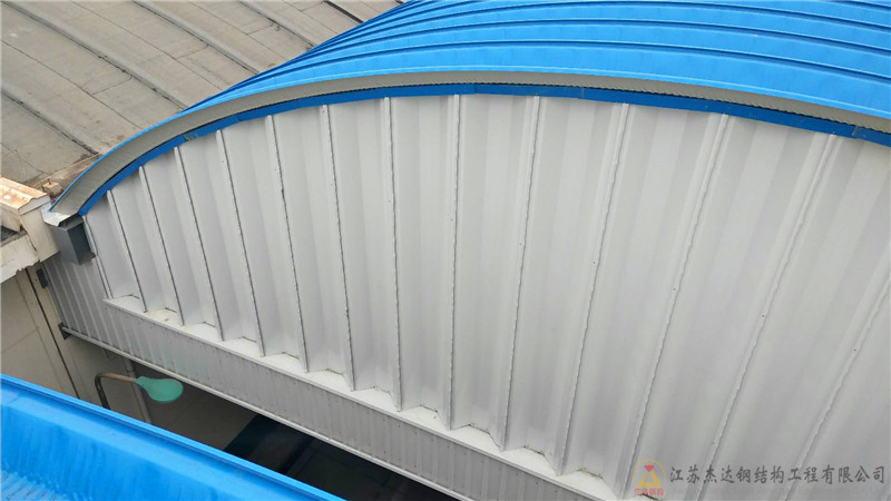 施工方面,江蘇杰達鋼結構工程有限公司施工團隊嚴格依照設計方案展開作業。現場照片顯示,彩涂卷板瓦片已完成生產,屋頂組裝工作正有序進行,部分拱形屋頂結構清晰可見,施工進展順利。