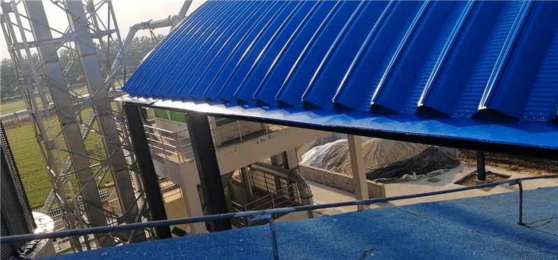 本次倉間罩棚工程采用拱形屋頂結構,整體建筑跨度為18米,長度達80米,總面積為1440平方米。屋頂材料選用了臺灣尚興1.0mm TS280GD-Z高強彩涂卷,表面顏色為海藍色,兼具防腐性與耐候性。