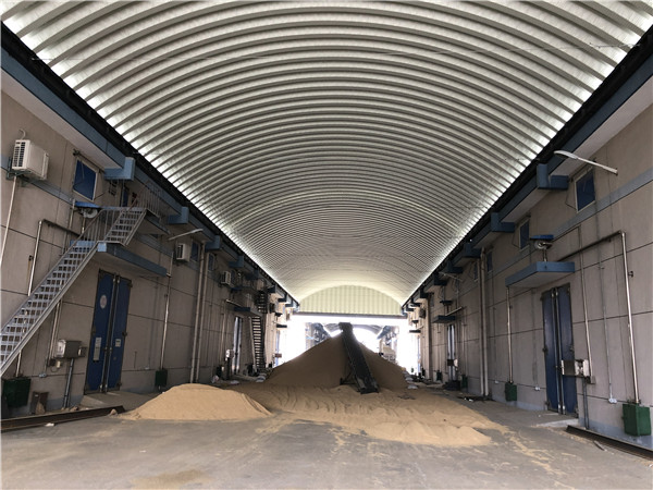 本項目是為如皋丁堰糧食儲備庫建設的倉間罩棚工程,屋頂采用寶鋼彩涂卷,材質厚度為1.0mm,顏色為乳白色,具備良好的耐腐蝕性能與穩定性。